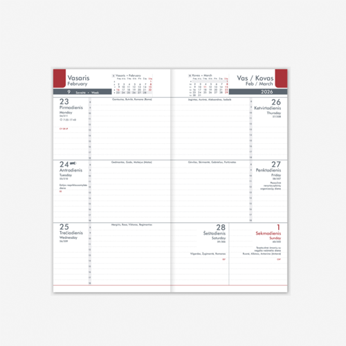 Darbo knyga – kalendorius MIDI. Mažas darbo kalendorius, skirtas detaliam darbų ir susitikimų planavimui. Kietas dirbtinės odos viršelis persiūtu krašteliu. Atvartas skirtas visai savaitei. Spalvotas šriftas, perforuoti lapų kampučiai. Kalbos: lietuvių, anglų. Kalendoriuje yra: valstybinės šventės, vardadieniai, 38 šalių valstybinės šventės su santrumpom, saulėtekio ir saulėlydžio laikas, mėnulio fazės, zodiako ženklai, mini kalendorius, savaitės numeris. Papildomi puslapiai: asmens duomenys, metinis planas, puslapiai užrašams, visų metų kalendorius, atstumai tarp miestų, pasaulio laikai, Lietuvos miestų ir tarptautiniai telefonų kodai. Užversto viršelio dydis: 90 x 167 mm. Viršelio spalva: bordinė.