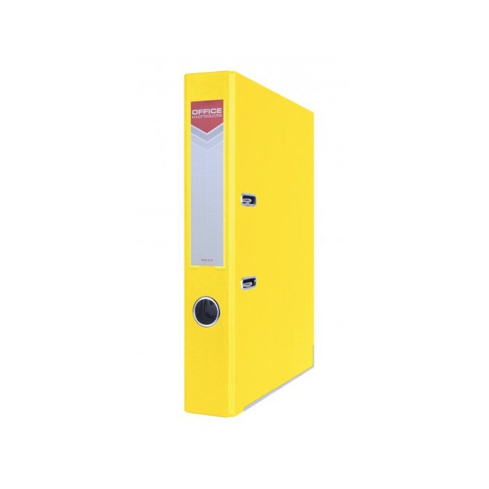 Segtuvas OFFICE PRODUCTS A4, dengtas plastiku (PP), su svertiniu mechanizmu, keičiama nugarėle. Nugarėlės plotis 50 mm. Susega iki 350 lapų. Metalu kaustyta apačia ir kampučiais. Spalva – geltona.