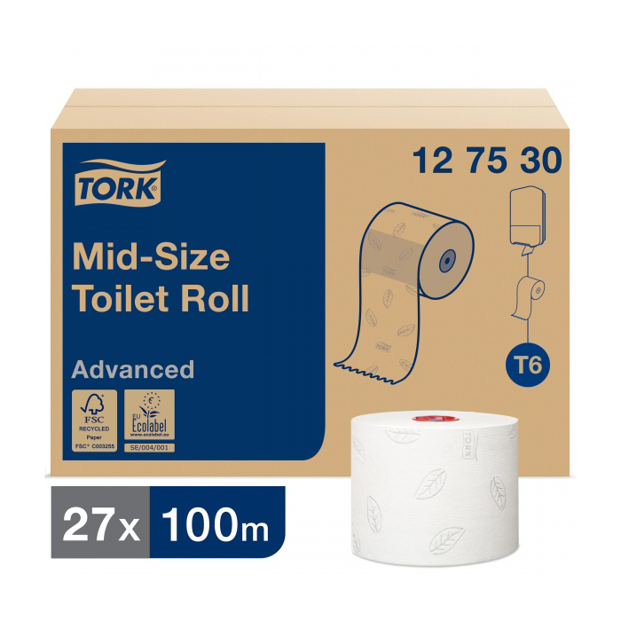 Tualetinis popierius kompaktiškais rulonais Tork Advanced T6, 2 sl. Rulonai, 2 sluoksnių, baltos spalvos. Rulono ilgis: 100 m, plotis: 9,9 cm. Patrauklus reljefinis dekoras sukuria dar geresnį įspūdį. Kompaktiškas vidutinio dydžio rulonėlis: kiekvienas prilygsta 4-5 įprastiems rulonėliams. Dedamas į Tork Twin Mid-size dozatorius, į kuriuos telpa 2 rulonėliai tualetinio popieriaus. Tinka neintensyviai ir vidutiniškai lankomoms WC patalpoms.